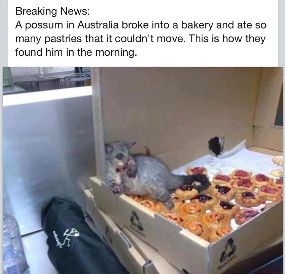 We’ve all been there: eaten so much we couldn’t move. This scenario typically unfolds during family holiday meals, where an abundance of delicious, homemade food graces the table. It’s a time when delectable dishes are shared and enjoyed in the warm and festive atmosphere of togetherness. This possum is no exception. It broke into a bakery and ate so many pastries that it couldn’t move.