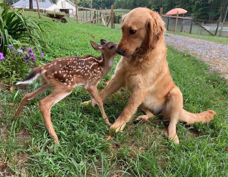 If this golden retriever possessed the ability to communicate, its probable inquiry would be along the lines of, “What’s happening in this situation?” It looks slightly afraid, but is letting the fawn sniff and play with her. The fawn appears unperturbed and relishes the companionship of her golden retriever friend. Real-life situations like this one prove that animals really can be friends.