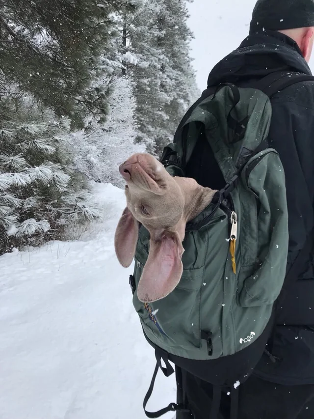 Snowy adventures are a cherished part of our childhood memories. Many of us have experienced moments when our parents had to carry us through the snow, a completely understandable and relatable aspect of growing up. But what about dogs? We usually expect dogs to play in the snow, with extra excitable energy. Here is a striking illustration of humans and animals coexisting in peculiar real-life circumstances. In this instance, the dog’s human had to carry their furry companion in a backpack while navigating through the snow. Despite the unconventional arrangement, it’s evident that the dog finds joy in the experience, sporting a content and happy expression.